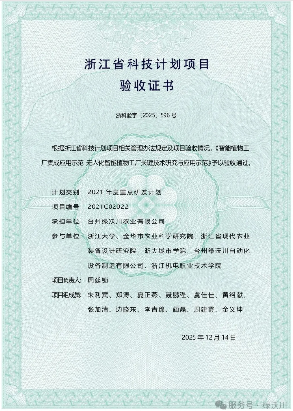 该项目计划编号为2021C02022,合同执行期为2021年1月1日至2024年12月31日,项目承担单位台州绿沃川农业有限公司。项目旨在研发与应用无人化智能植物工厂关键技术,推动现代农业装备升级与产业示范。